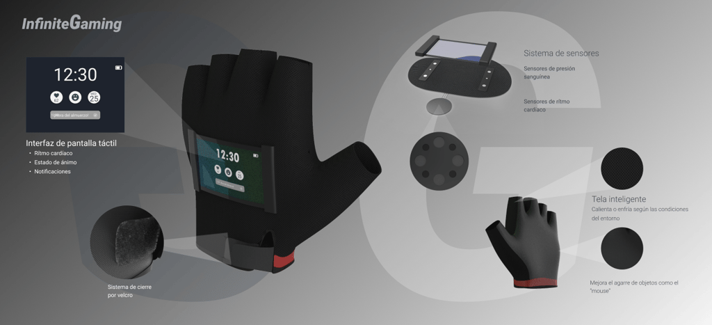 A smart glove designed for gamers and streamers who spend long hours in front of the computer. Its goal is to improve quality of life by monitoring vital signs and providing alerts with personalized recommendations.